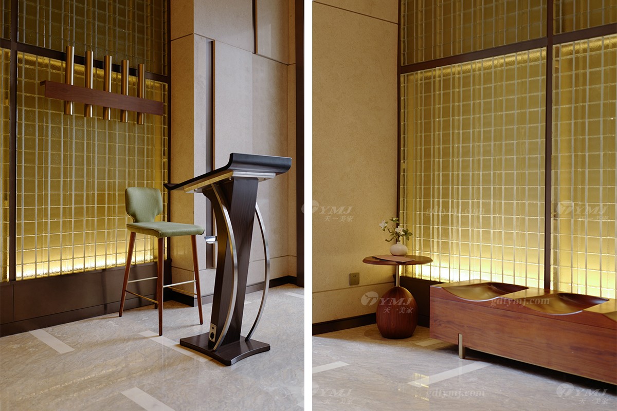 穿过电梯过道,即是酒店前台服务大堂,空间敞亮,原木色木条装饰而成的吊顶,造型独特的不锈钢金属球形灯,别具一格。隔壁的吧台由实木结合大理石打造而成,旁边一张两米多实木长功能桌,纹理深邃细腻,凸显高质感和档次,可以点一杯咖啡,坐在吧椅上跟朋友一起细细品味、随意聊天,很是惬意。