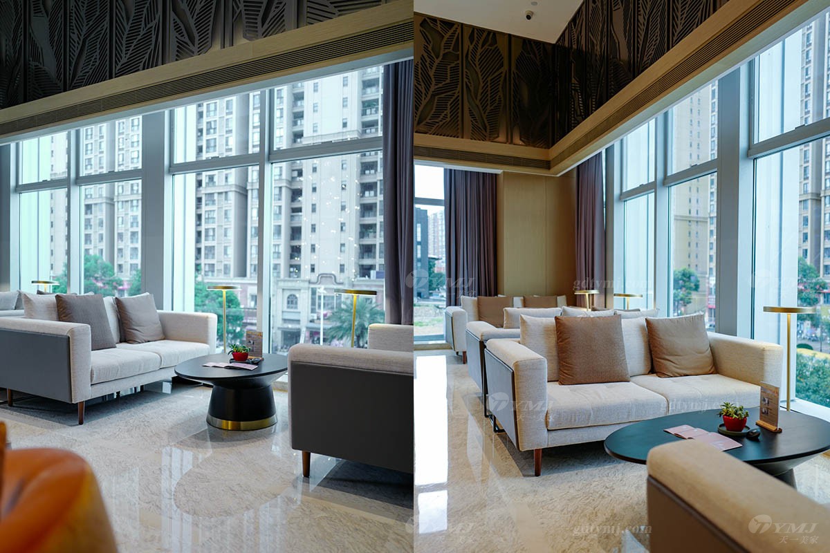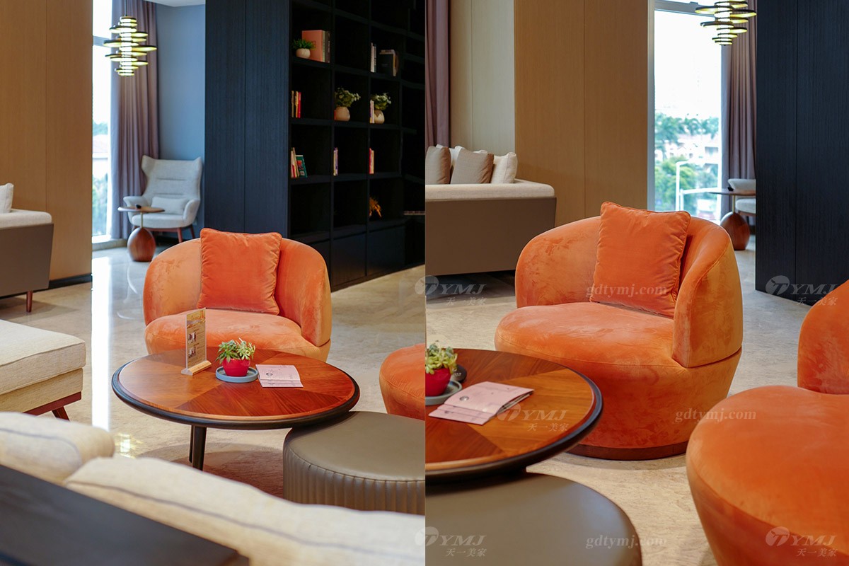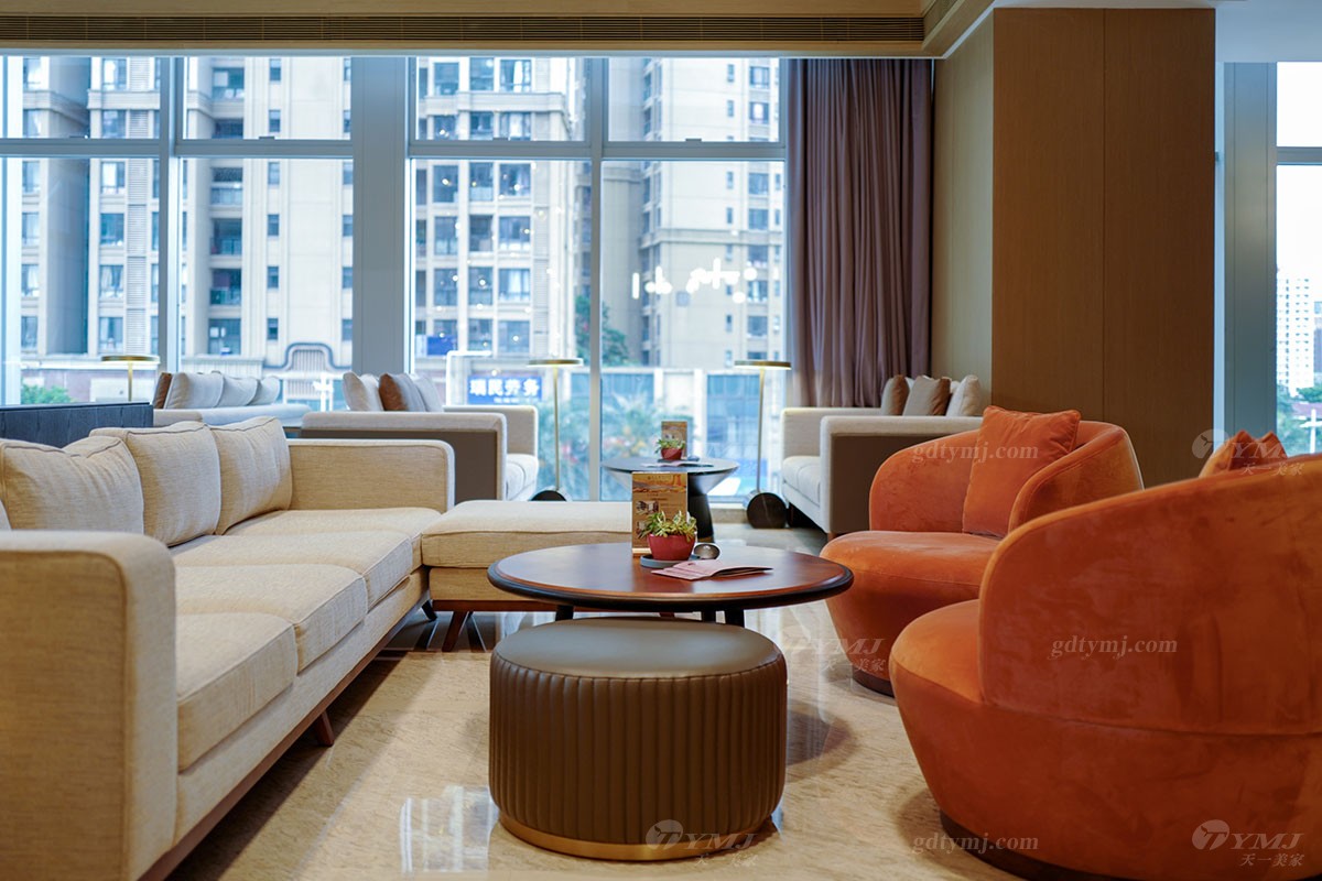公共休闲洽谈区拥有270°全景超大落地窗,自然采光非常充足,挑高的天花顶,让空间通透明亮,柔和的灯光下,整体呈现灰色调布艺沙发中散落几抹亮橙色休闲椅,使得整个氛围活跃起来,搭配精致的装饰,让每一处细节都透露着不凡的品味。在繁忙的旅程或商务日程中,这是一处不错的静谧而又不失格调的休憩之地,坐在舒适沙发上既可觅得片刻宁静的个人时光,亦或可与重要伙伴闲聊、会谈。
