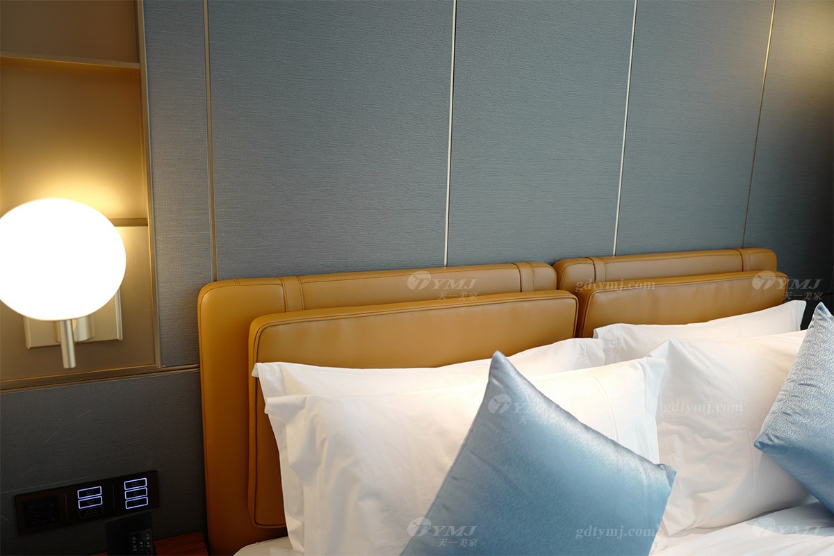 雅致双床房首先映入眼帘的是一整面灰蓝色纯色装饰的背景墙,色调略显深邃而宁静;两张橘黄色皮艺大床铺上蓝、白色系的床品,显得既优雅舒适又充满清爽活力,与背景墙灰蓝色的基调相映成趣,使得整个空间地多增添了几分温馨、和谐。