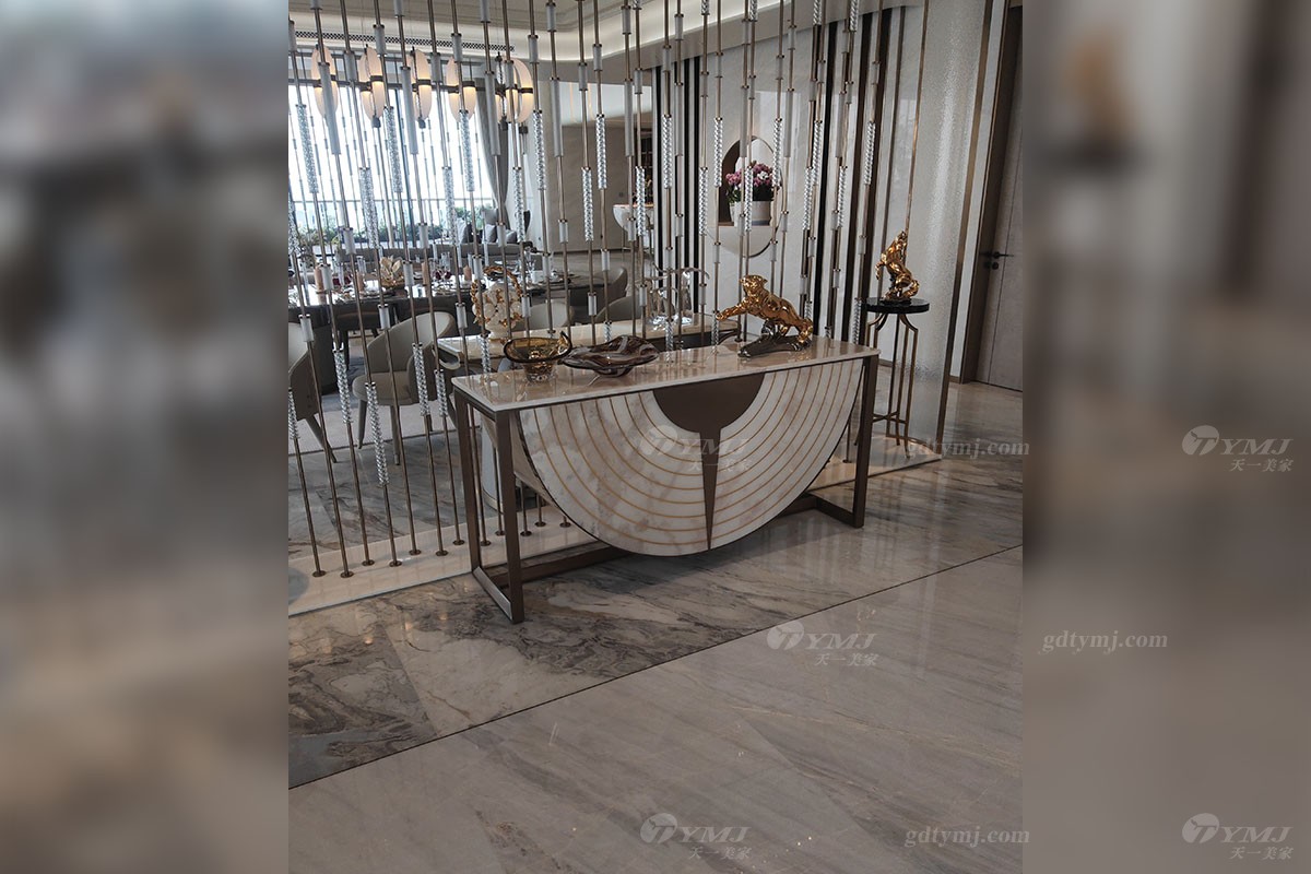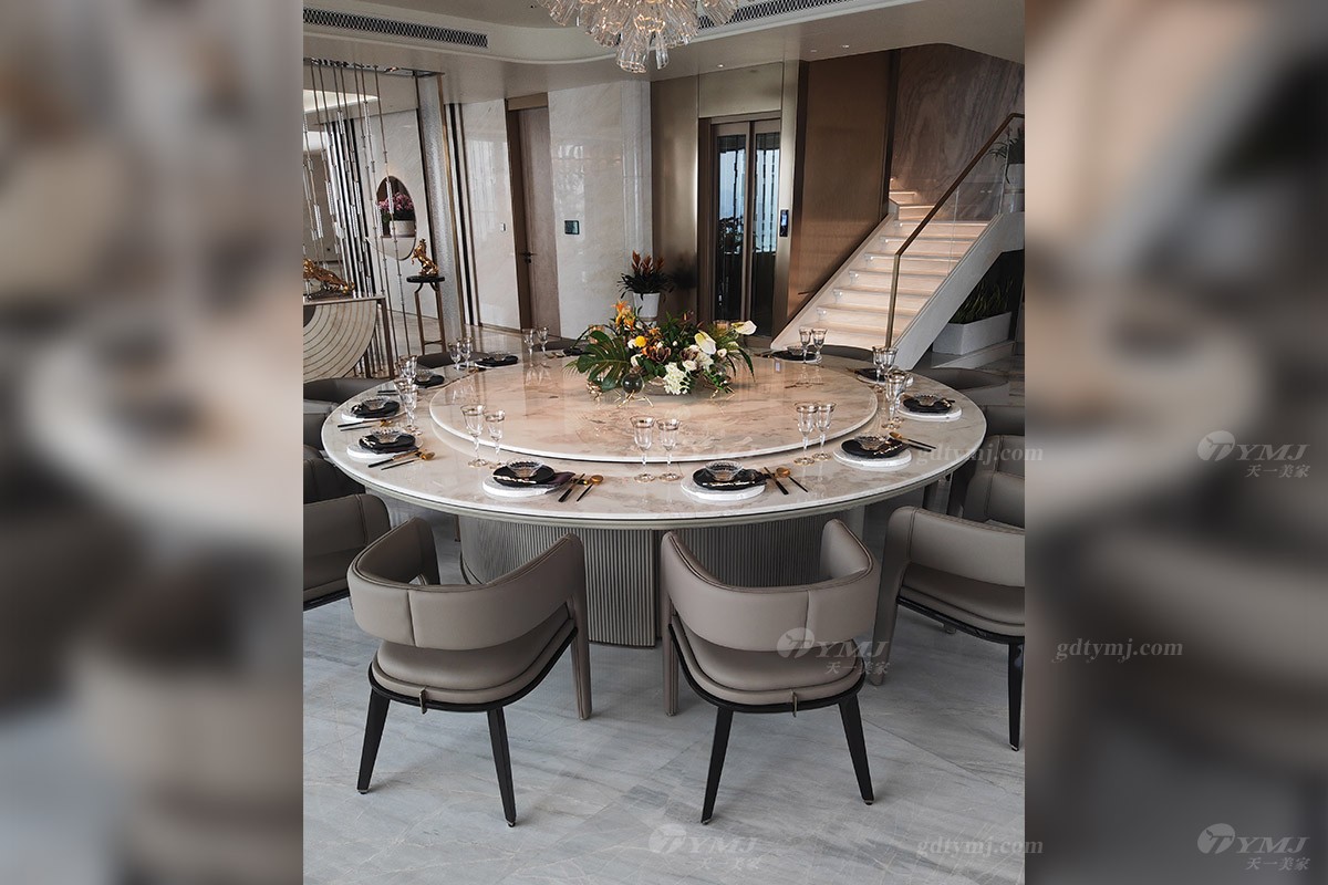 由客厅透过一道时尚的金属装饰隔断,便是餐厅区,餐厅区共分两部分,分别为可容纳10人座的西式大理石长餐桌,底座由两个大圆柱体支撑着整个天然大理石台面,奢华又大气,让你感受到来自西餐的浪漫。与之对应的便是一张可容纳12人的大圆形餐台,时尚灰色皮艺餐椅,与圆餐台大理石色调搭配完美融合、和谐统一,彰显高雅、奢华感十足。