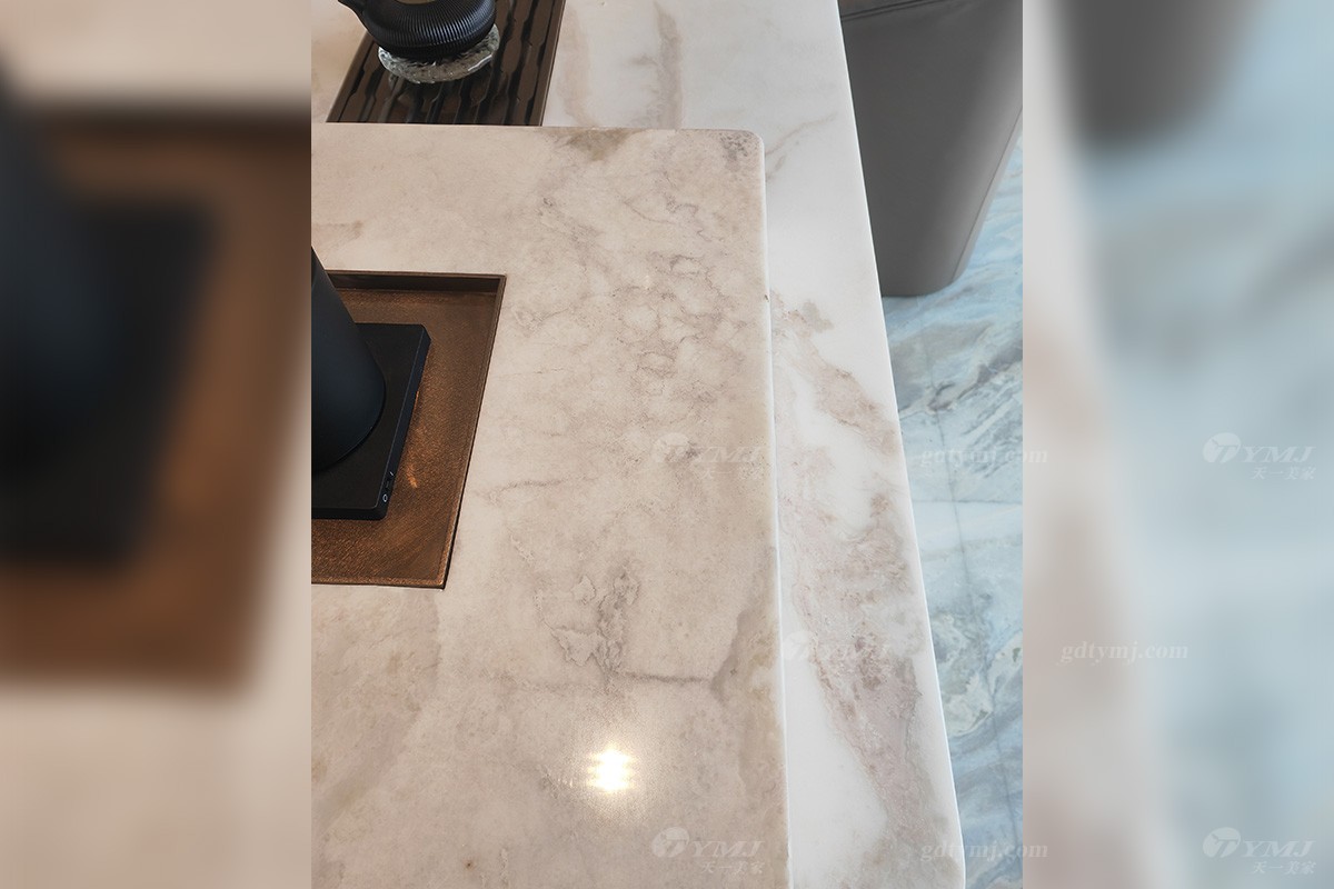 开放式的茶室区,视野非常开阔,空间通透,同样采光充足,中间一张长达2米多的大理石长茶台,由精选天然白色大理石结合实木精心打造而成,镶嵌金属条配饰,细节感满满。闲余时分,约上三五知己抑或独自一人,可一边慢慢品茶一边欣赏外面无尽美景,甚是惬意。