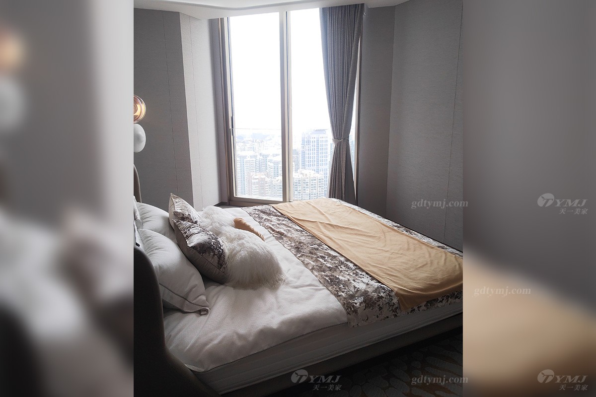 卧室自带大阳台,由超大落地玻璃窗隔绝了来自外界的喧嚣与侵扰,还室内一片安宁,但是并不妨碍温暖的阳光肆意洒进来,带给人通透明亮的心境享受;宽大的床屏由金属框架结合实木及布艺工艺精制而成,色调与墙壁背景色融为一体,低调而不失高雅,创意悬挂式的床头灯,形状独特,暖色调光源,增添了温馨氛围,整个卧室空间从设计到家具、软装搭配布局集奢华、实用性、温馨舒适于一体。